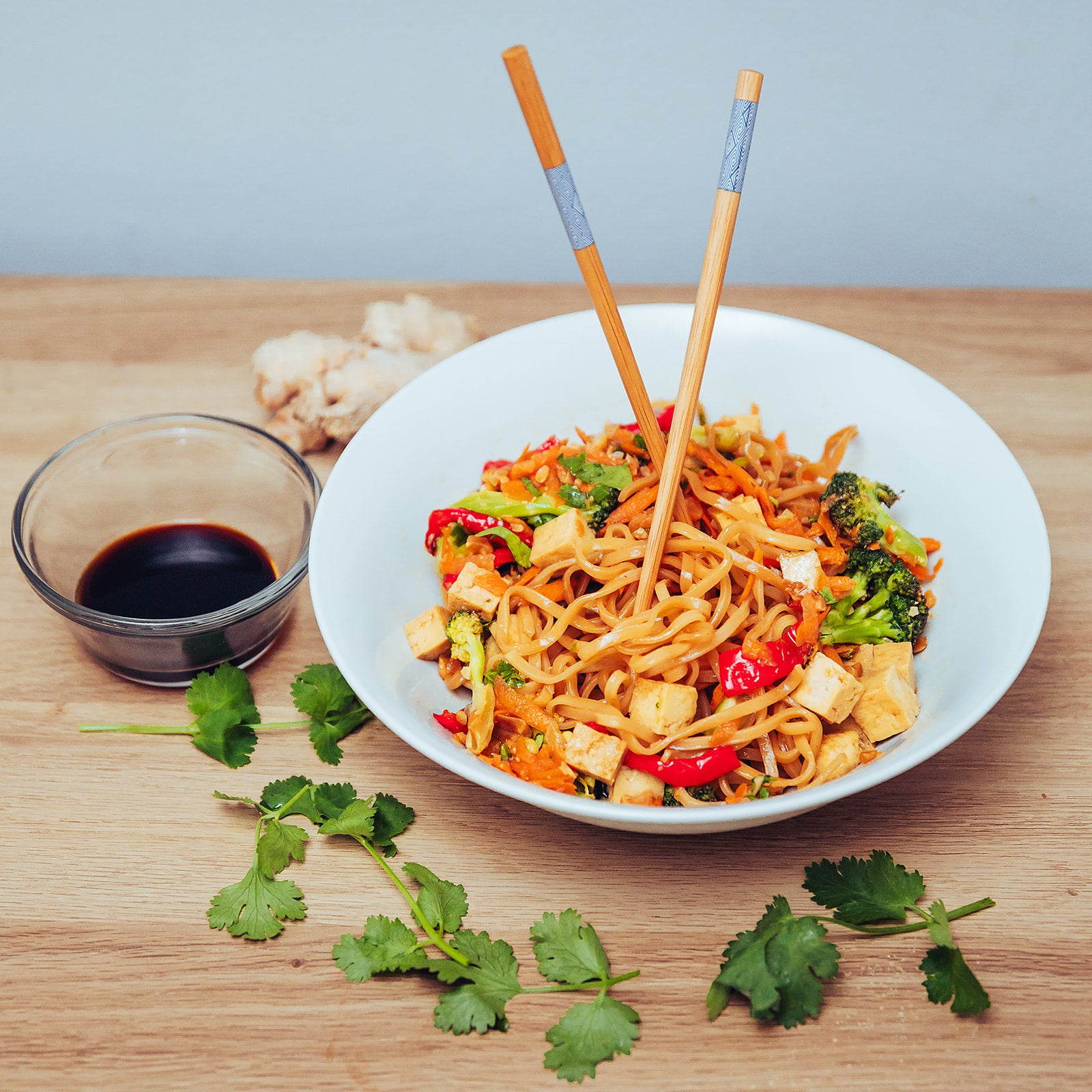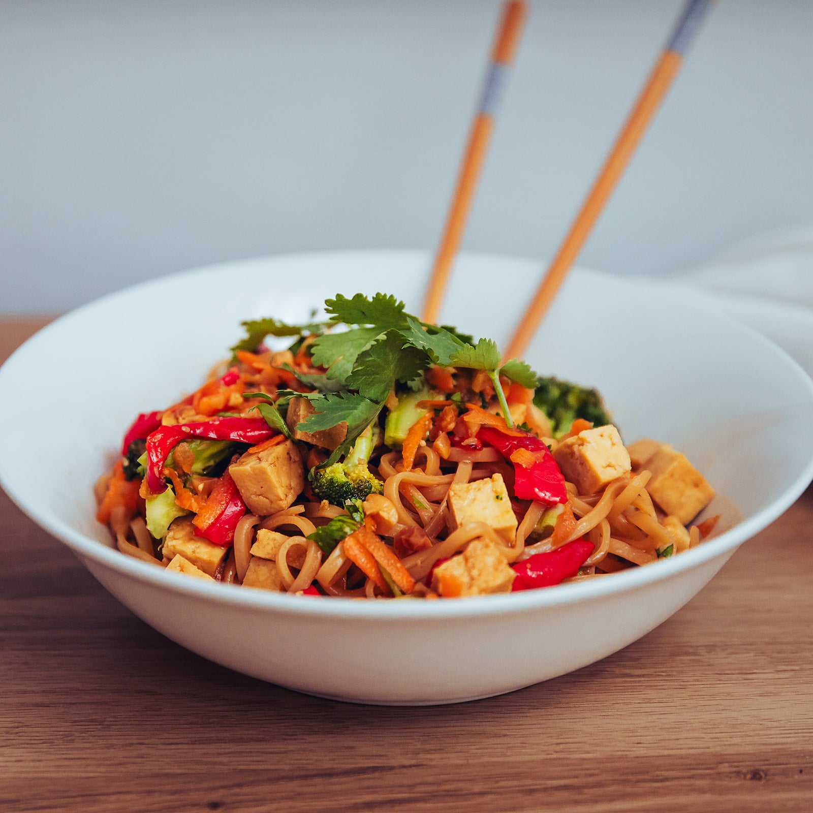 Ingrédients : Tofu, brocoli, poivron rouge, nouilles de riz, carotte, arachide ou sans arachides, oignon vert, coriandre et sauce pad thaï (sirop d'érable, sauce tamari sans gluten, jus de lime, vinaigre de riz, gingembre, huile de sésame, sriracha)