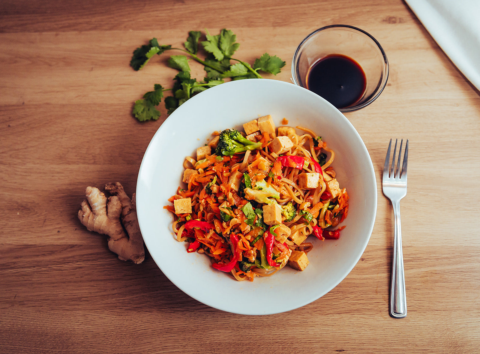 Le Pad Thaï est un repas populaire de la cuisine de rue à Bangkok, mais on préfère celui qui est servi dans les restaurants. Le tofu légèrement frit, les légumes colorés et les nouilles sont accompagnés d'une délicieuse sauce sucrée au gingembre. Une variante sans arachide est aussi disponible.