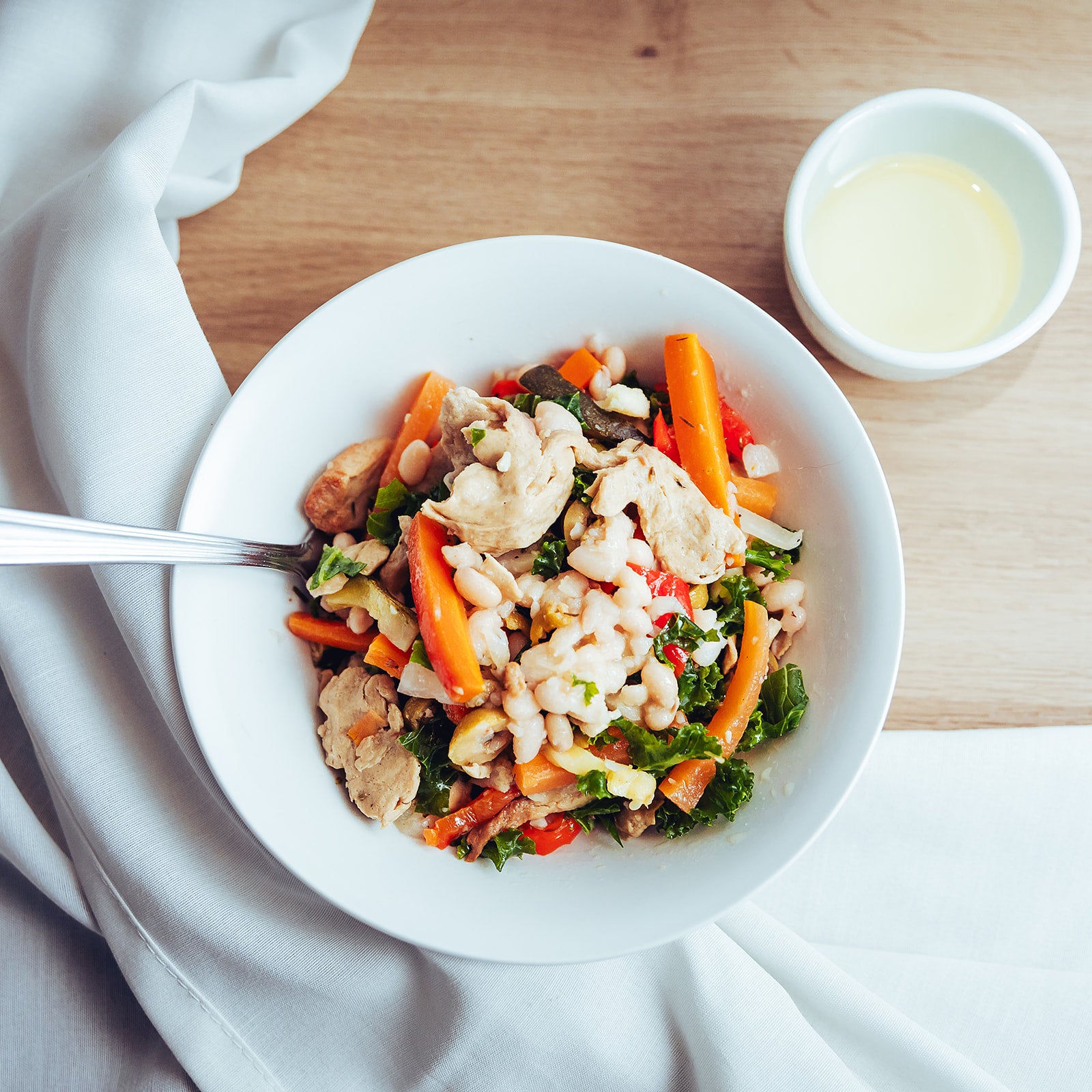 Ingrédients : Chou-fleur, courgette verte, carotte, oignon rouge, patate grelot, poivron rouge, seitan (protéines de blé, eau, pommes de terre, huile d’olive, levure alimentaire, sauce tamari biologique (soya), fécule de maïs, sel de mer, levure alimentaire), vinaigre blanc, huile d'olive, huile de tournesol, olive verte, fève blanche, eau, oignon, sirop d'érable, sel, origan et thym.